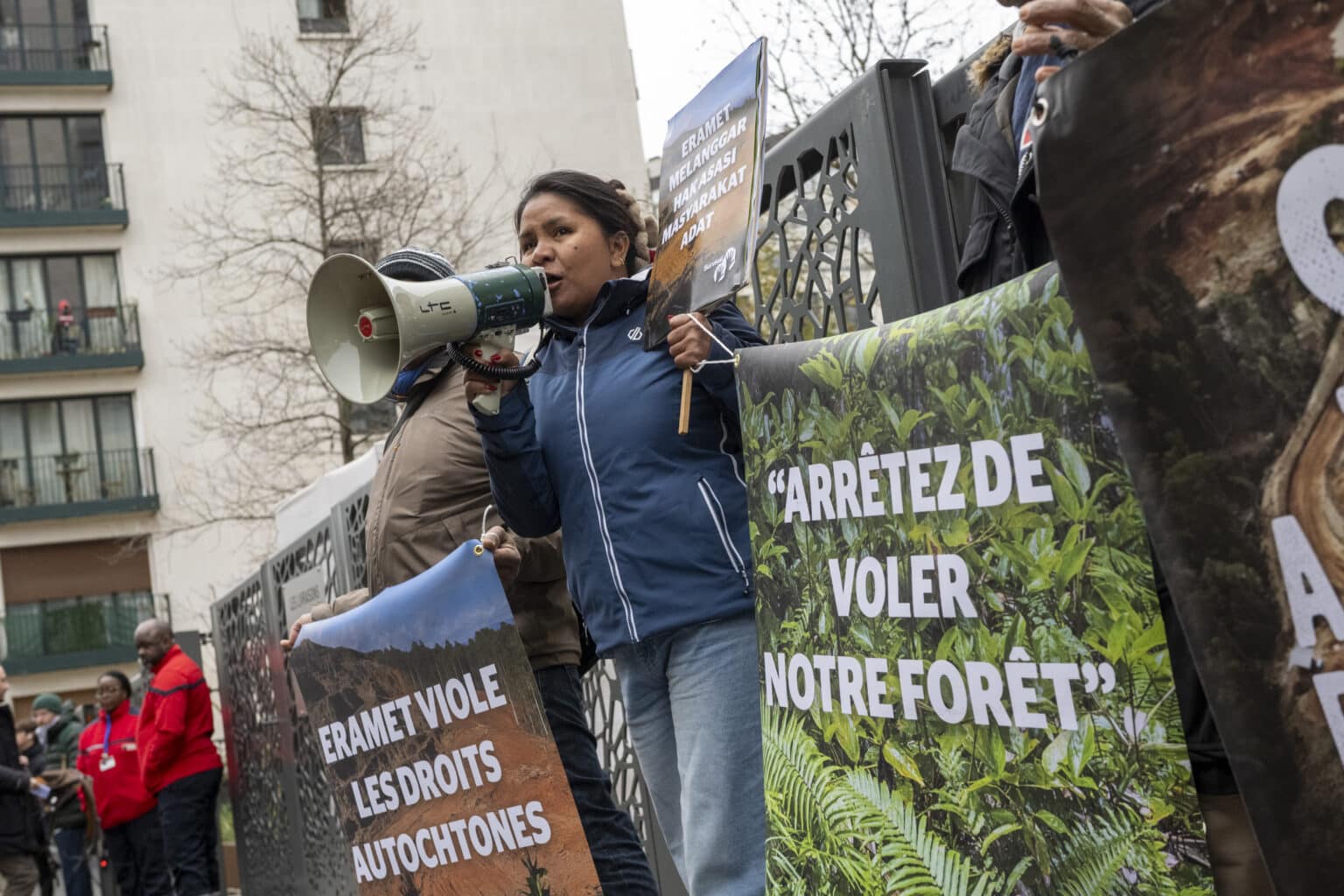À Paris, des manifestants dénoncent Eramet, qui détruit la forêt des Hongana Manyawa non contactés. © Etienne Begouen / Canopée