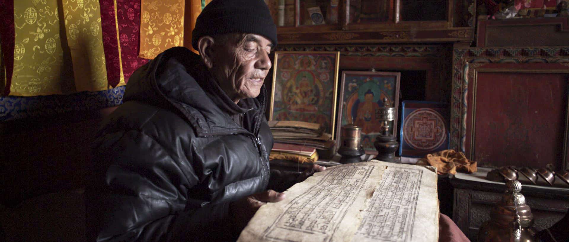 TT Namgail prie régulièrement dans sa petite salle de prière. J’ai eu la chance d’assister à son rituel, il m’a laissé filmer ses chants sacrés qu’il lisait dans des parchemins très anciens ramenés du Tibet par son grand-père.