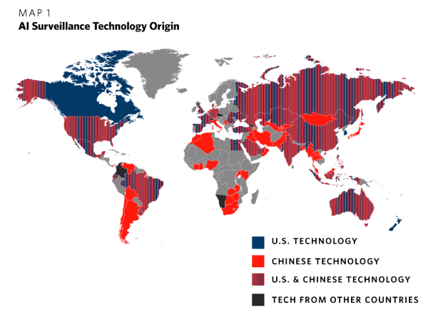 En matière d’IA et de surveillance, les entreprises chinoises dominent largement le secteur. À elle seule, Huawei est présente dans 51 pays, faisant d’elle le principal fournisseur mondial de technologies avancées de surveillance par IA.