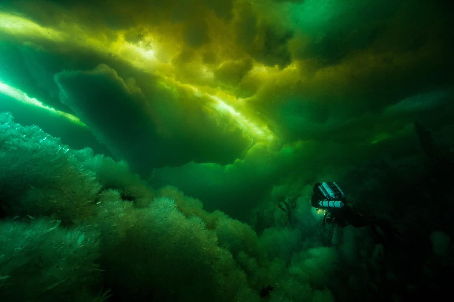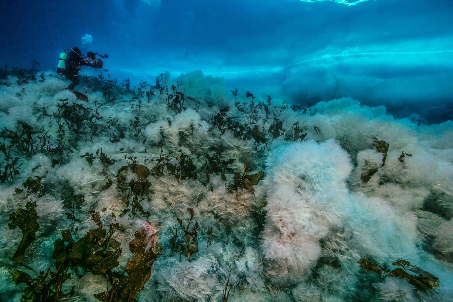 Forêt de grandes algues brunes laminaires, prise dans les cristaux de glace, 15 mètres © Laurent Ballesta, Expedition Wild-Touch Antarctica!