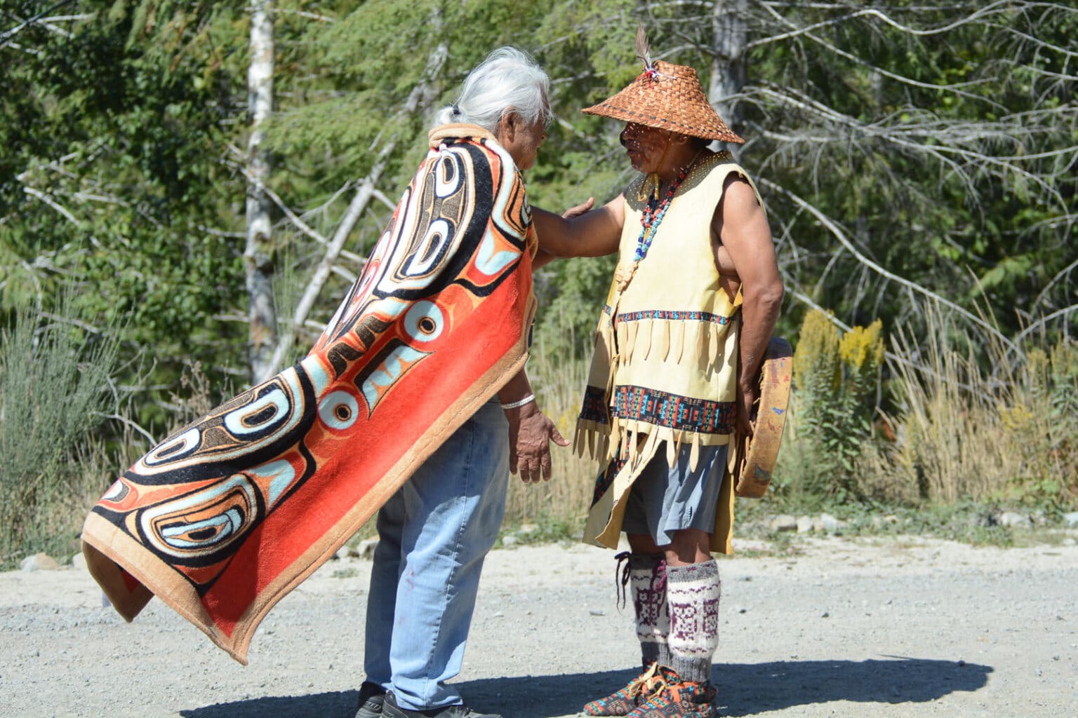 L’aîné Bill Jones reçoit une couverture de l’aîné Robert George de la nation Cowichan sur le site du mémorial de la robe rouge du blocus d’Adai’stx en 2022