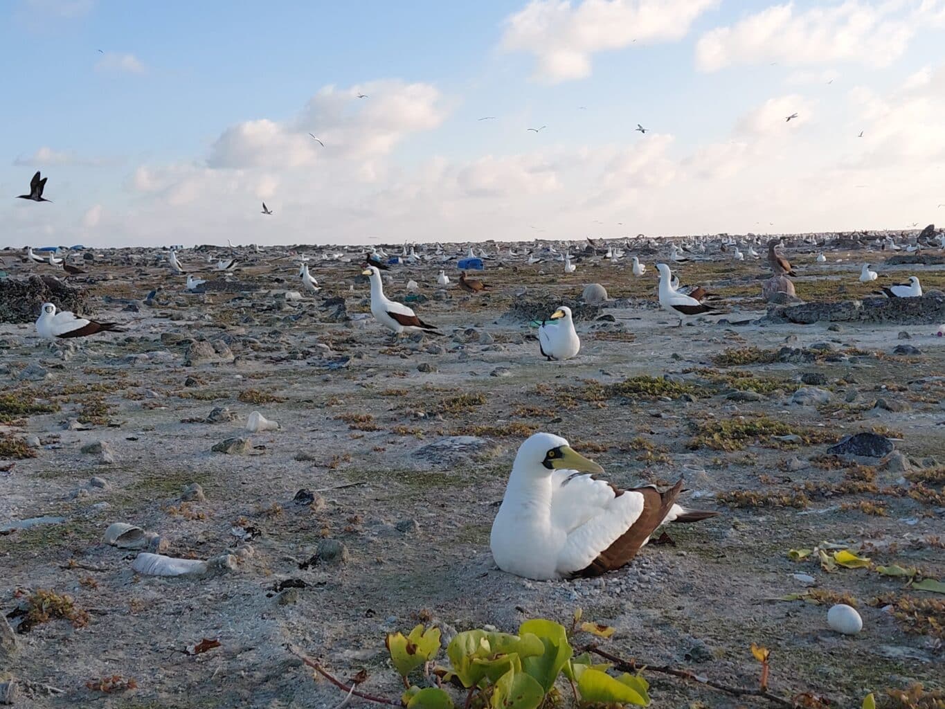 Avec entre 120 000 et 150 000 oiseaux marins concentrés sur 170 hectares, Clipperton détient une densité exceptionnelle, cinq espèces de fous, mais aussi des sternes et des noddis. Si les effectifs de fous masqués ne montrent pas encore de déclin net, d’autres espèces sont déjà au bord de l’effondrement.