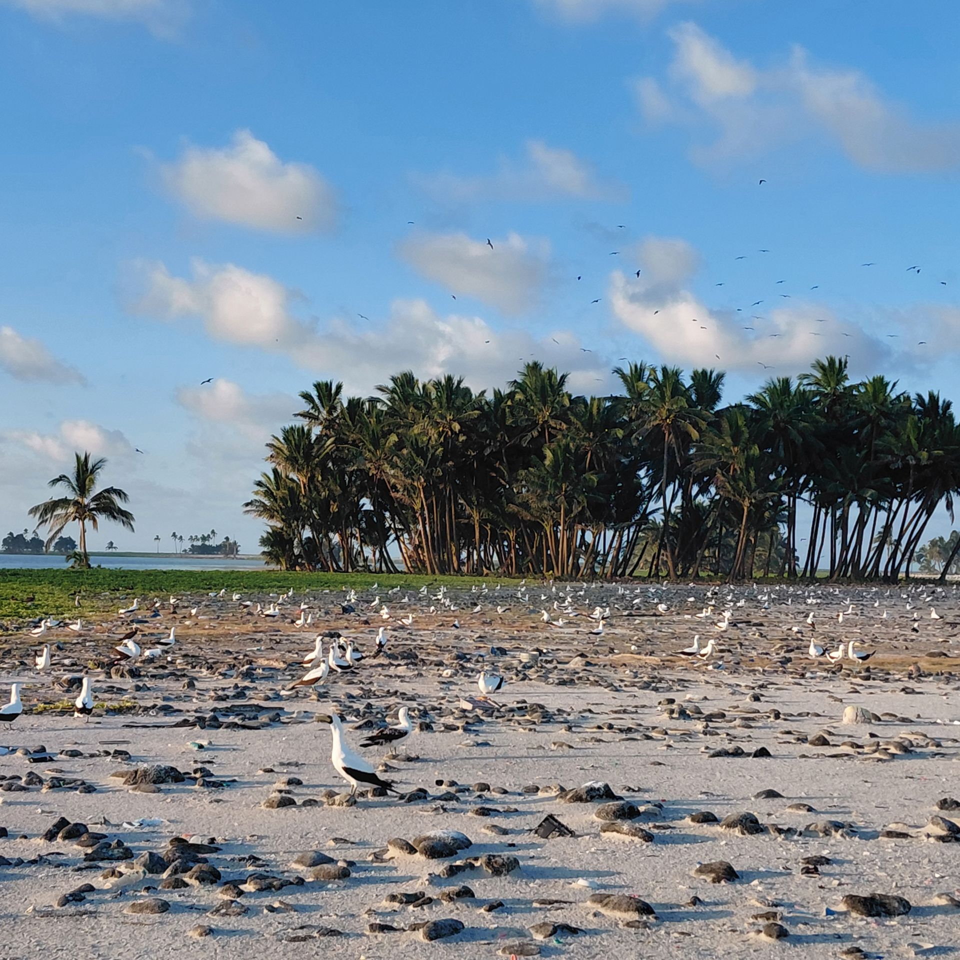 Avec entre 120 000 et 150 000 oiseaux marins concentrés sur 170 hectares, Clipperton détient une densité exceptionnelle, cinq espèces de fous, mais aussi des sternes et des noddis. Si les effectifs de fous masqués ne montrent pas encore de déclin net, d’autres espèces sont déjà au bord de l’effondrement.