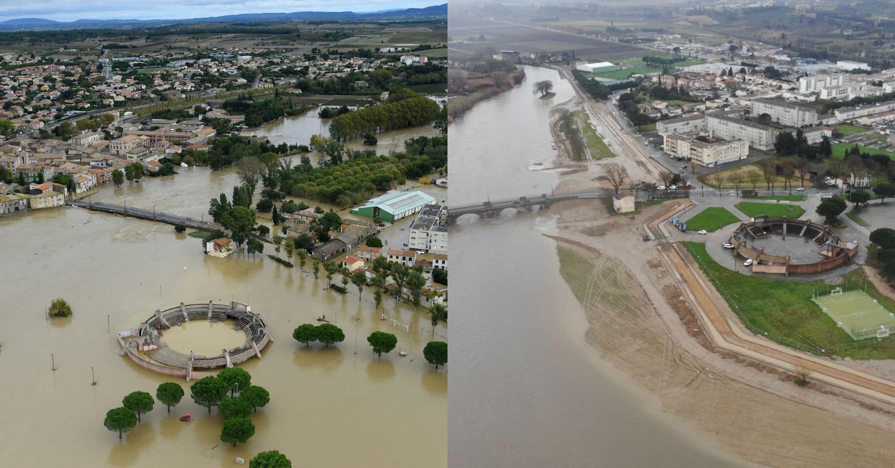 A Trèbes, qui avait été submergé par les inondations de 2018 avec de nombreuses routes coupées, bâtiments détruits et six morts, la rive droite de l’Aude a été agrandie : délocalisation d’une école, suppression d’une piscine, d’un camping, et d’un lac. Résultat, ce projet d’adaptation a parfaitement fonctionné.