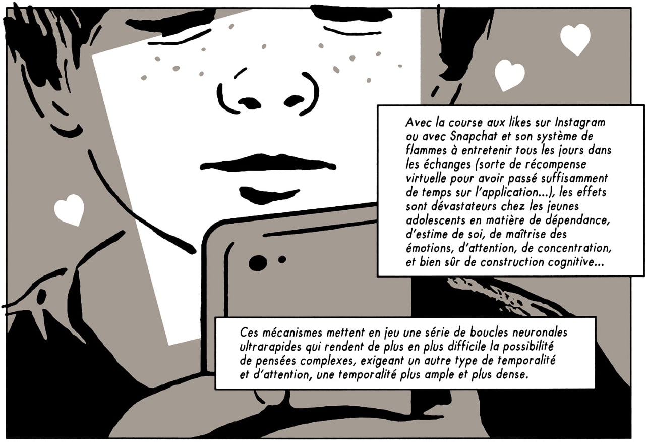 LR&LP : Autre postulat que vous avez exploré, c’est que contrairement à l’écriture qui s’est développée sur du temps long, soit plusieurs siècles, les algorithmes ont colonisé le monde entier à une vitesse incroyable en 15 ans à peine, ce qui n’a pas permis au cerveau de développer des mécanismes de régulation et de protection. Quelles sont les conséquences de la numérisation de nos modes de vie sur le développement du cerveau ?