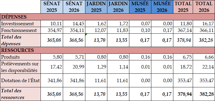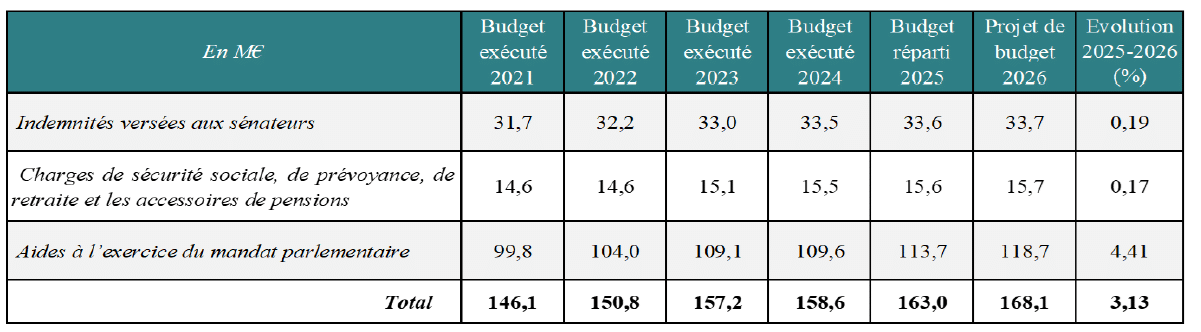 En 2025, le budget exécuté du Sénat s’est élevé à 378,94 millions d’euros. Pour 2026, la dotation publique inscrite au budget de l’État atteint 353,47 millions d’euros, tandis que le total des dépenses prévues pour l’institution s’élève à 382,3 millions d’euros.