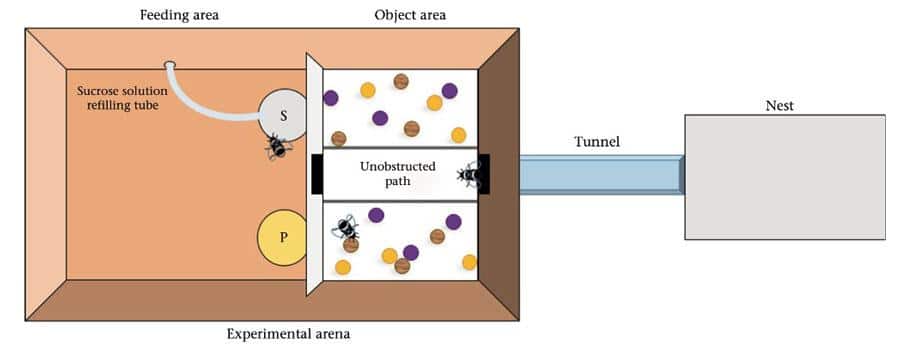 Le dispositif permettait aux bourdons de se déplacer librement dans l’aire de nourrissage, où de petites boules en bois de différentes couleurs, certaines fixées et d’autres non, étaient disposées le long du trajet pour qu’ils puissent interagir ou non avec elles.