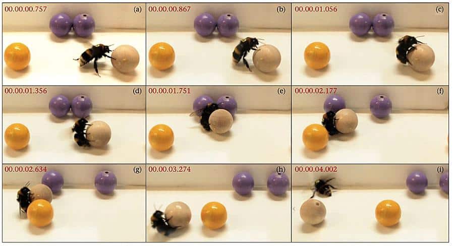 Dans cette expérience, lorsqu’ils vont se nourrir ou rentrent à la ruche, les bourdons ne remarquent les billes qu’au dernier instant. Malgré leur cargaison de pollen ou de nectar, beaucoup s’arrêtent pour jouer avec les billes, prouvant que ces objets ne sont pas considérés comme de la nourriture, mais comme une forme de distraction.