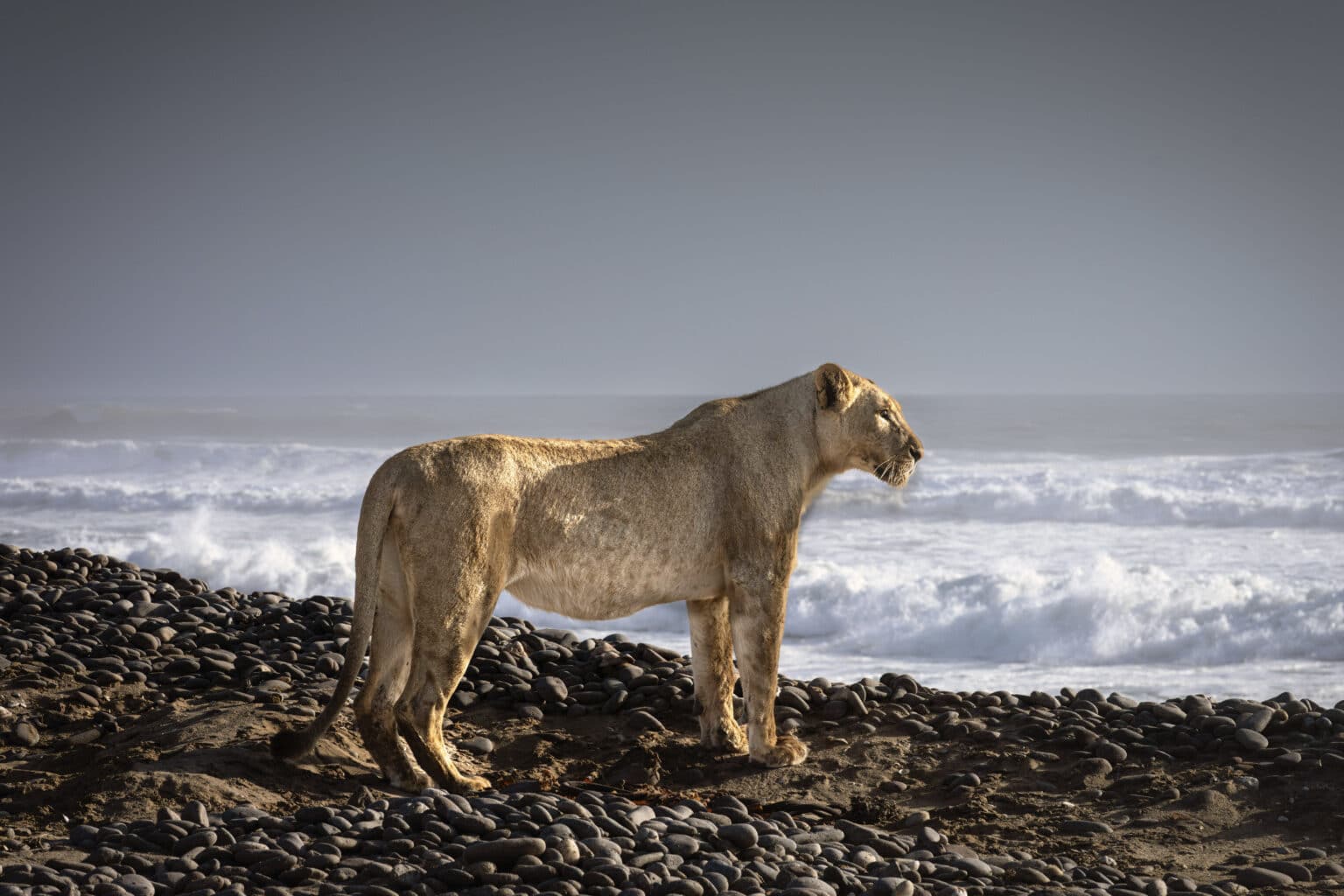 La scène semble irréelle. Une lionne est paisiblement couchée sur une plage de galets noirs. En face d’elle, les vagues de l’Atlantique s’abattent sur le rivage. Elle s’appelle Gamma. Ce fauve du désert vit sur la Skeleton Coast, au nord-ouest de la Namibie, là où le désert rencontre la mer. Et elle appartient à un groupe au comportement inédit. Ce sont les seuls lions au monde à chasser des proies marines, essentiellement des otaries à fourrure du Cap.