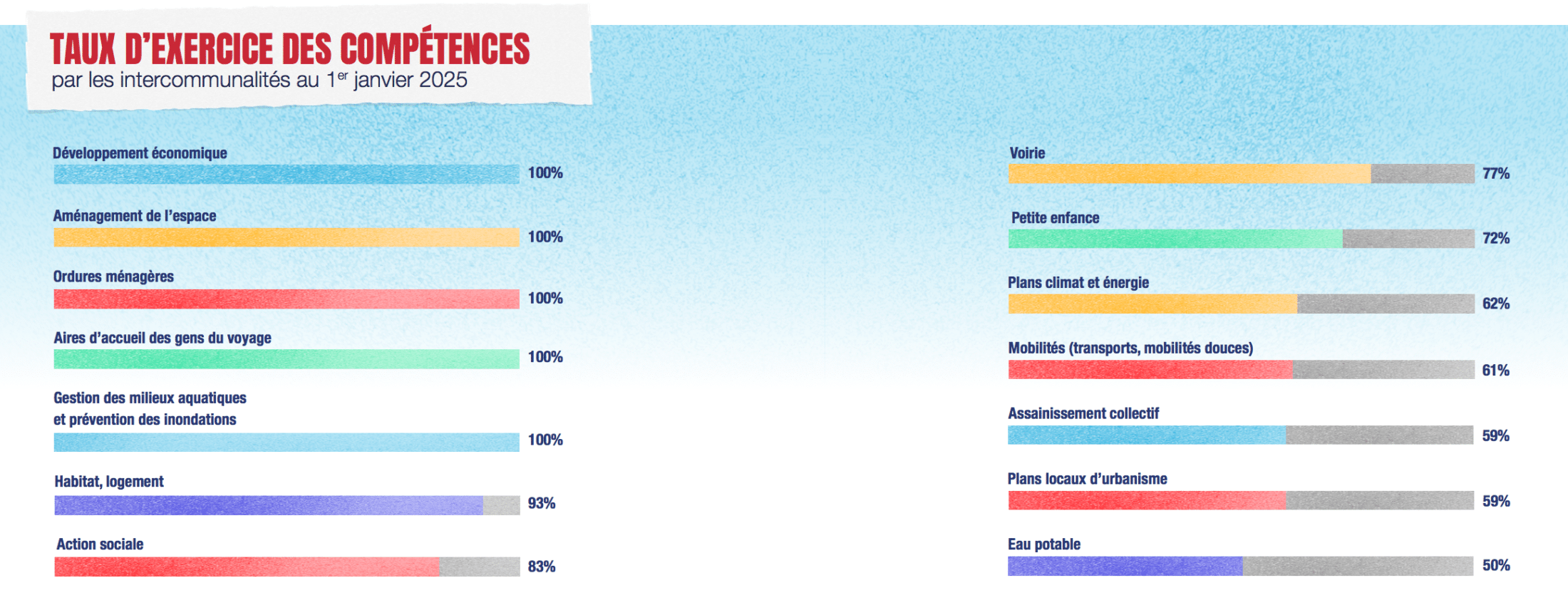 « La commune agit sur les compétences qui lui sont propres (proximité et vie quotidienne, éducation, espaces publics, action sociale communale…), tandis que l’intercommunalité exerce plusieurs compétences transférées (développement économique, mobilités, culture, gestion des déchets, etc.). »