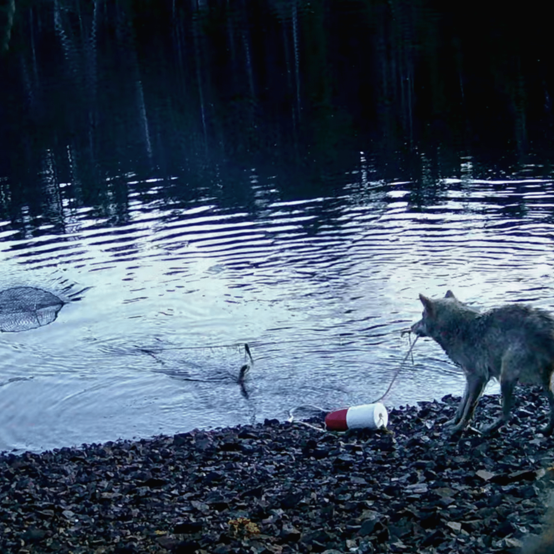 « Le piège était entièrement immergé et non-visible depuis le rivage, ce qui suggère que le loup reconnaissait que la bouée était attachée à une corde, à son tour attachée à un piège invisible contenant des appâts comestibles. »